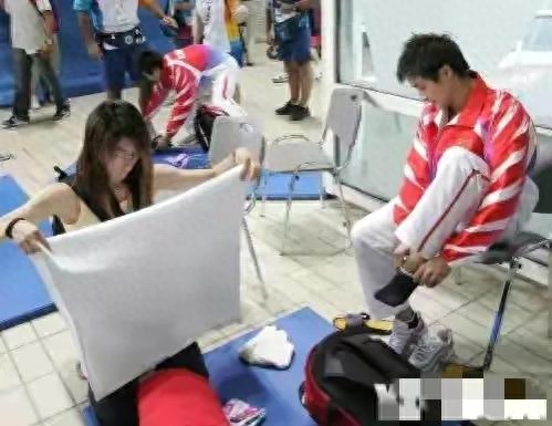 比赛结束后,田亮坐在凳子上穿鞋子,郭晶晶则跪坐在地上给他整理毛巾。