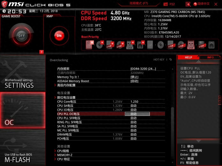 CPU PLL OC电压:锁相环电压,默认1.2V,降低到1.14-1.16V就可以大幅度减少CPU发热,而且几乎不会损害稳定性。超频请务必降低这个电压!
