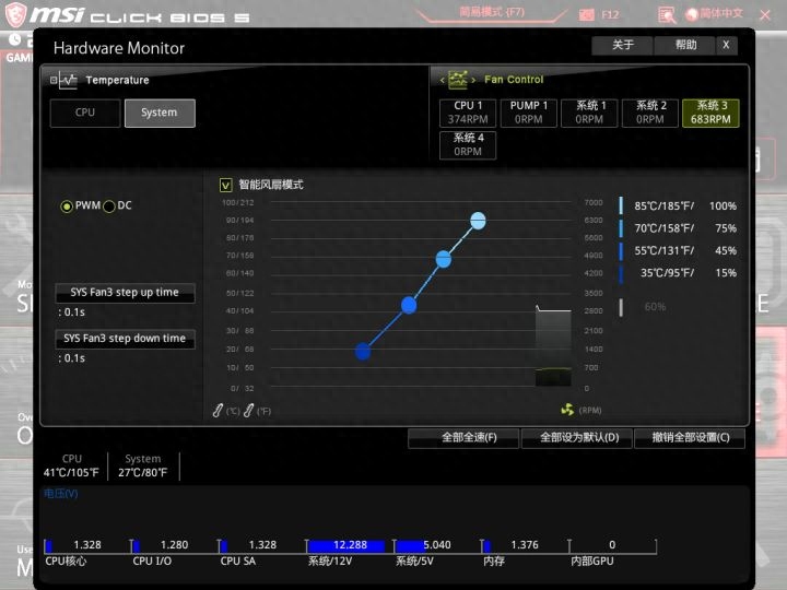 需要注意的是:微星主板不存在温度临界值,华硕板子是75度临界值,达到临界值就会强制满转速吵死人。但是我们千万不能因为不存在临界值就胡乱设置转速,如果你过分追求静音设置90度也只有40%转速,那可能会直接导致高温重启。华硕临界值的选项虽然不够灵活,但是也是出于保护考虑。只能说,这两种方案各有利弊。