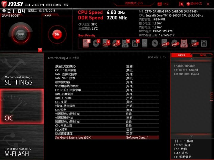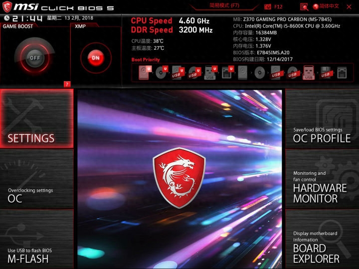 下面六个选项,SETTING: 超频以外的其他设置选项; OC:超频设置; M-FLASH:用于升级BIOS,只需要在微星官网下载BIOS文件到U盘然后启动M-FLASH即可升级。 OC PROFILE:保存用户的超频设置,有时候我们可能需要多种超频设置,一种用于极限超频装逼,一种用于日常稳定使用。每次都重新调整参数太麻烦,这个选项就是用于保存设置。 HARDWARE MONITOR:控制风扇温度转速关系; BOARD EXPLORER:可视化界面查看主板信息,没卵用。