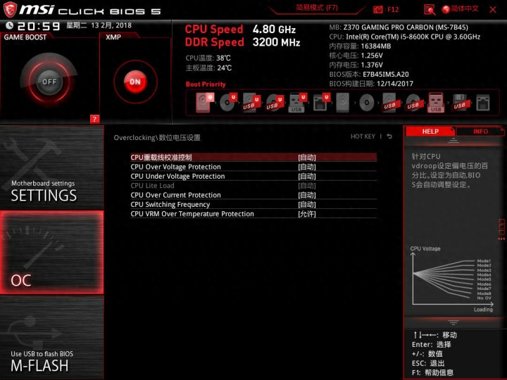 CPU重载线校准控制:俗称“防掉压”,和华硕主板不同,微星主板一般设置3级就行。这玩意等级8 9是疯狂降压,等级1则是疯狂加压。一开始我们尝试8级防掉压,电压直接从 1.30V降到1.26V,这样做太冒险了。设置3级后变成1.312V,嗯,可以接受。超频的话这个选项必须设置!!!!