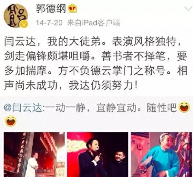 而此时的闫云达在外面也没有什么更好的出路,而在德云社他的位置可是多少人眼红的,试问现在,多少人想做郭德纲的大弟子啊!