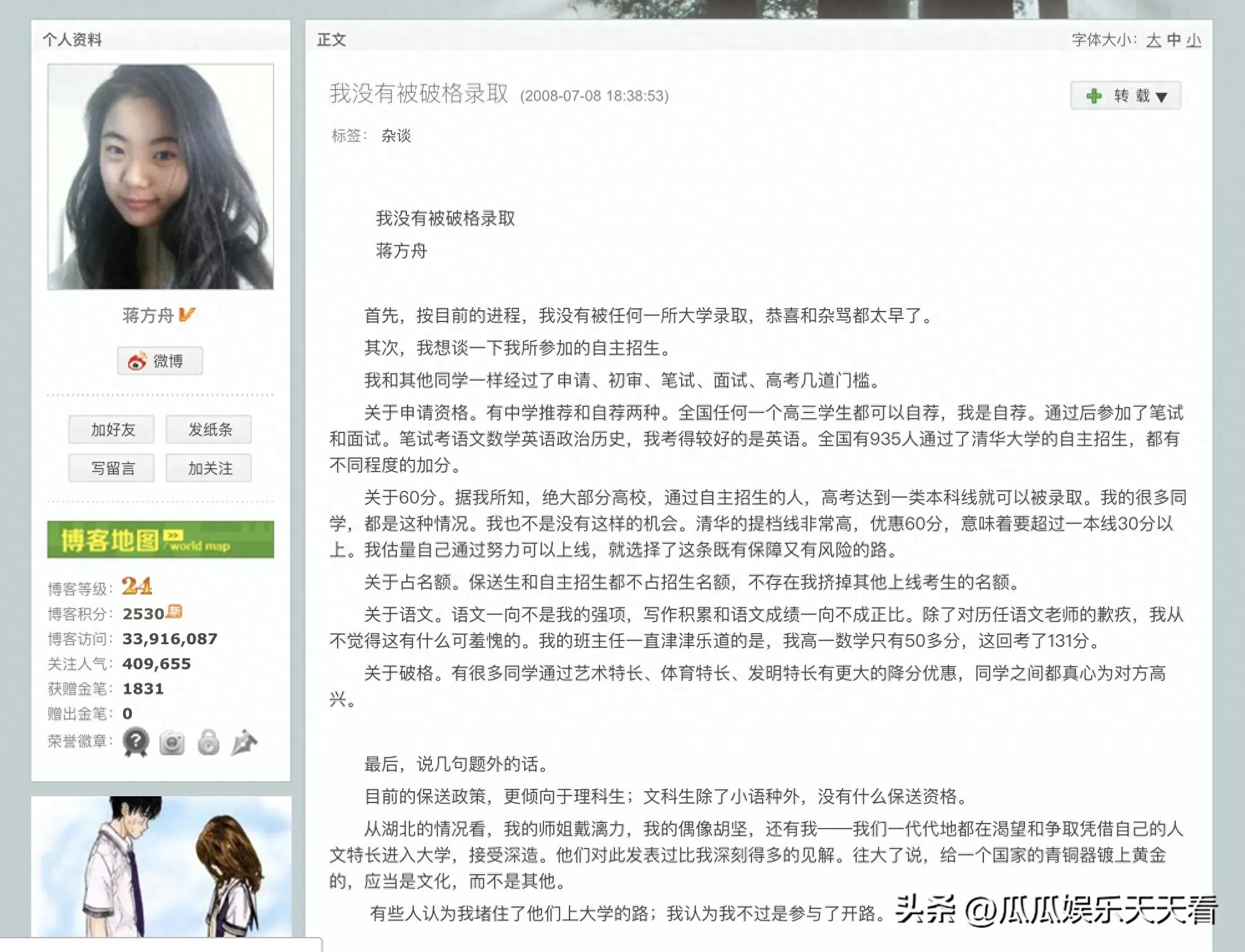 高三那年,蒋方舟通过自主招生考入清华大学,