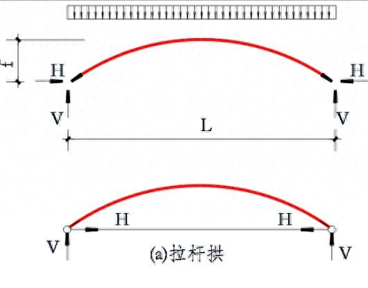 结构横向为主受力方向,采用预应力拉杆拱。拱结构采用混凝土结构,拱内的压应力使得混凝土的材料性能可以充分发挥。拱脚巨大的侧推力由拱脚的拉杆承担,拉杆采用钢索,并在钢索内施加预应力,产生100mm的反拱,以抵消外荷载引起的变形。