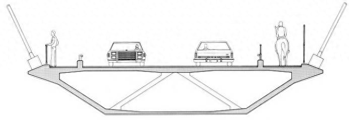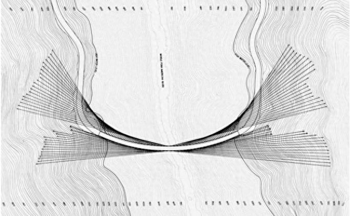 Ruck桥位于距加里福利亚(California)10英里的奥本坝水库上。桥梁长度约396米,主梁方案为钢箱曲梁,曲率半径457.20米;众多的钢拉索组成了空间双曲面索面,四个索面的拉力代替了桥梁墩台,承载了整个桥梁的荷载,所以全桥没有一个桥墩;拉索按照曲线的布置规律地锚固在两边上坡上,利用两边山体的岩石自重及岩体地质特性来充当强大的地锚结构,以此来平衡桥梁的荷载。