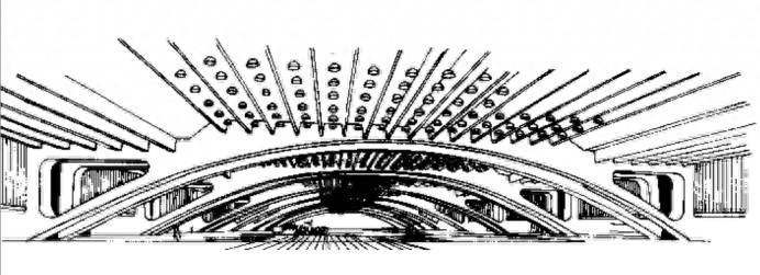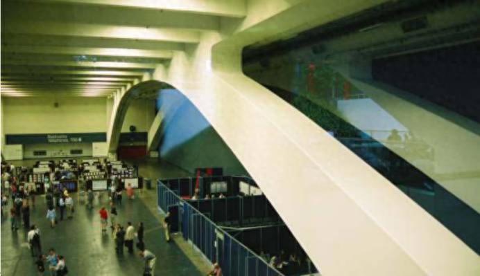 旧金山莫斯康尼会议中心地下展厅跨度90m,荷载34KN/m2,是典型的大跨重载结构。针对结构特点,林同炎提出了预应力混凝土拉杆拱体系,完美地解决了大跨重载的问题。