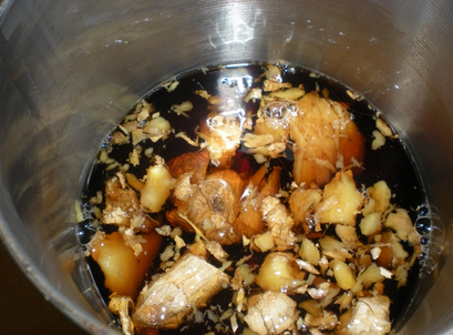 1.生姜切碎拍碎放入锅中,我这个是那天做姜汁剩下的,想想手柠也柠不了多少姜汁出来,再用用吧,自己现做可以切丝。