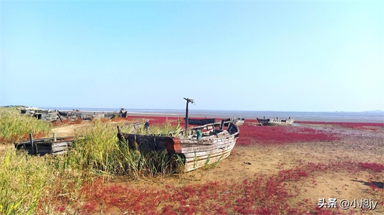 此时正值退潮,大片滩涂裸露,有小船搁浅在滩涂上,我们顺着海岸的沙滩向前走,海滩边岩石林立,远望前方一片红色,那就是红海滩了。