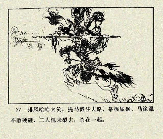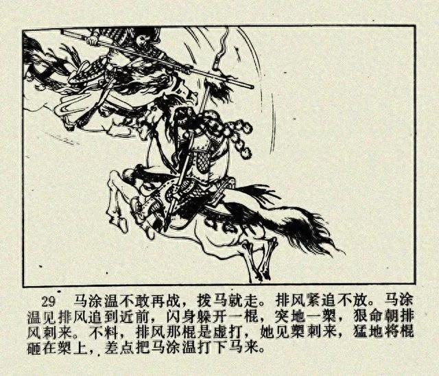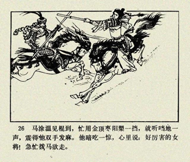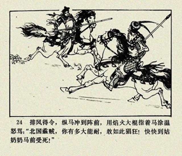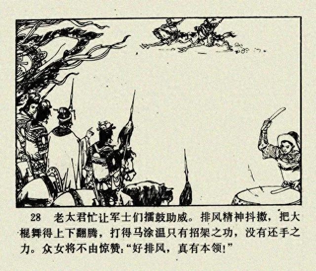 杨排风反问:"女的怎么啦,你看不起呀?今天来的全是女将,专打你这个男的。看棍子!”说完,烧火大棍劈头盖顶,奔马涂温 头上砸来。马涂温 看不起排风,用塑往上崩,“当!”觉得有点份量,“嗒嗒嗒嗒”战马跑出老远。