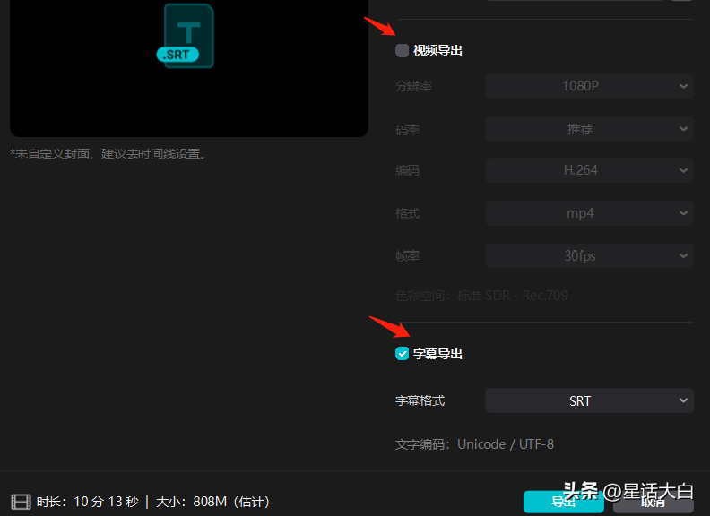 在导出选项里,把“视频导出”的“√”去掉,然后保留字幕导出,这样就可以单独导出SRT的字幕文件了。