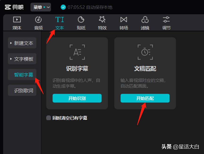 然后点上方的“文本”按钮→再点左侧菜单的“智能字幕”→再点文稿匹配