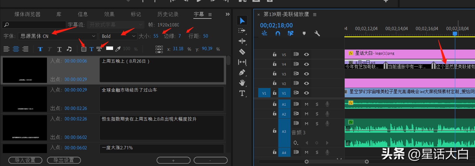 在这个字幕选项卡里,可以选择字幕的字体,记得用“思源黑体”,可以修改字体大小、样式,最重要的是,可以给字体加上边缘,这样可以让字幕更加清晰。
