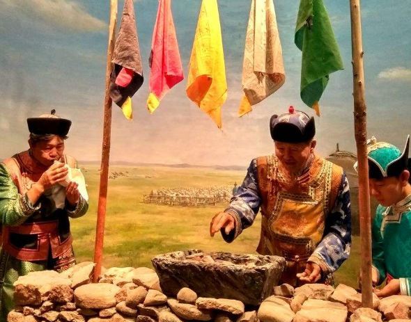 《蒙古秘史》记载:“那年春间,俺巴孩皇帝的两夫人斡儿伯、莎合台,祭祀祖宗时,诃额伦去得落后了,祭祀的茶饮不曾与。”这是早期的蒙古族氏族部落的祭祖。《元史》载:“其祖宗祭享之礼,割牲,以蒙古巫祝致词,盖国俗也。”这是蒙古族家族的祭祖。至元三年,太庙成,定八白室,每年十月享祭祖宗于太庙。明代时,蒙古人还祭祀成吉思汗及其所属的“八白室”,明代中叶以后,在孵尔多斯伊金雷洛,由达尔哈特部负责祭祀成吉思汗,称祭成陵。按照传统的习惯,一年四季分季进行祭祀,举行仪式,牧民们汇聚到陵前,怀着崇敬的心情,悼念这位名震中外的“一代天骄”。