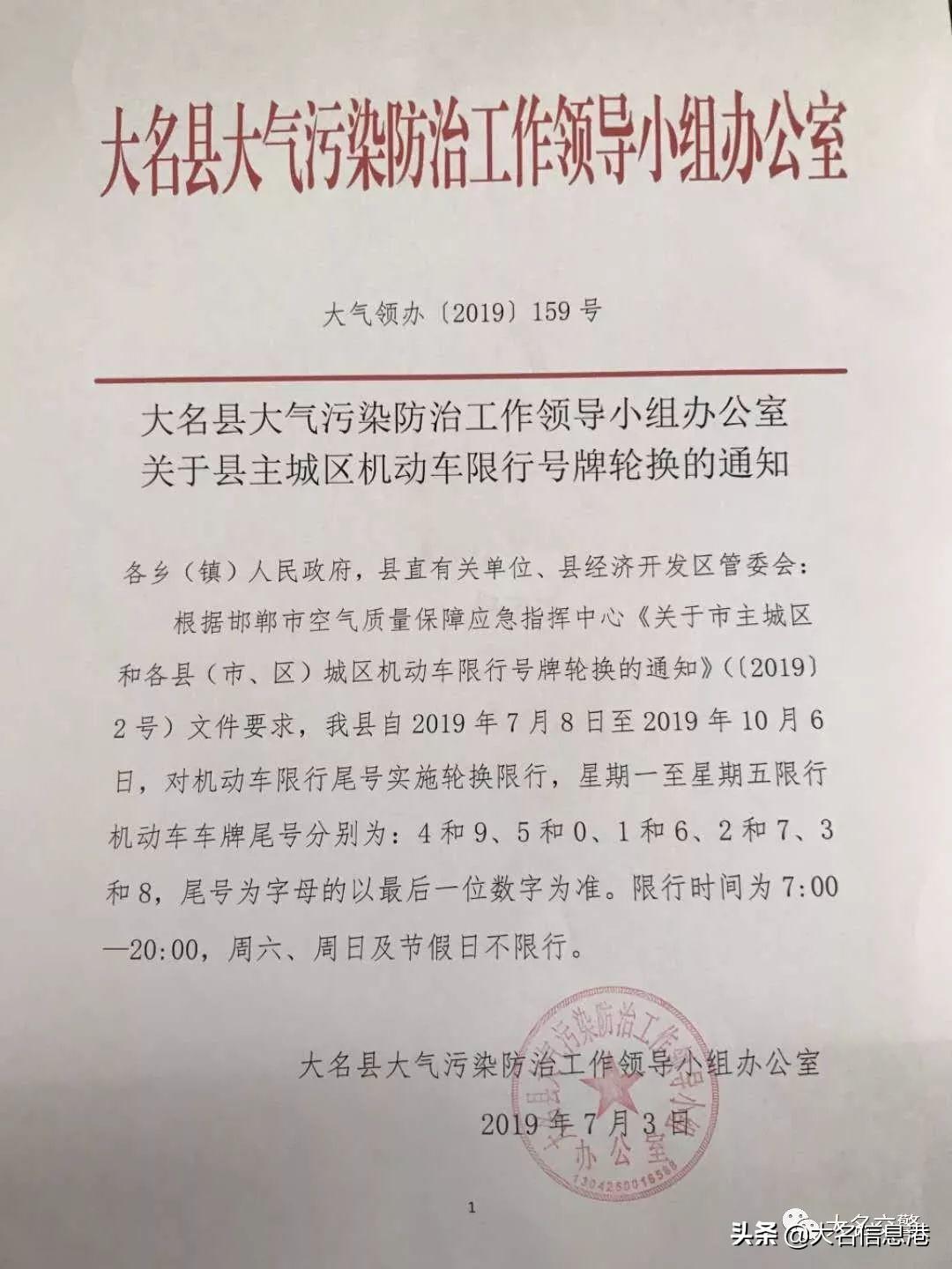 根据大名县大气污染防治工作领导小组办公室要求,县主城区实行机动车限行,通知如下: