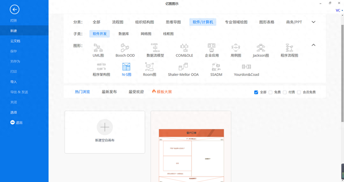 第二步:打开软件,新建盒图。在软件界面上依次点击分类中的“软件/计算机”、子类中的“软件开发”、图形中的“N-S图”。然后从模板图库中,选择适合的模板进行快速绘图,点击模板、使用,进入模板编辑页面。