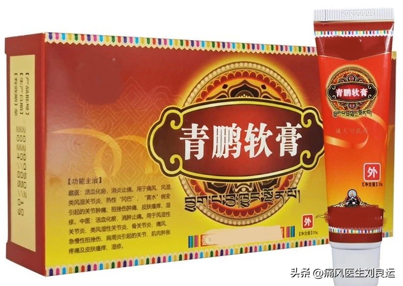 (8)青鹏软膏:为外用药膏。成分为棘豆、亚大黄、铁棒锤、诃子(去核)、毛诃子,余甘子、安息香、宽筋藤和人工麝香等。主要用于皮肤瘙痒、湿疹及痛风患者活血化瘀、消肿止痛。但皮肤破损、孕妇忌用,运动员慎用。