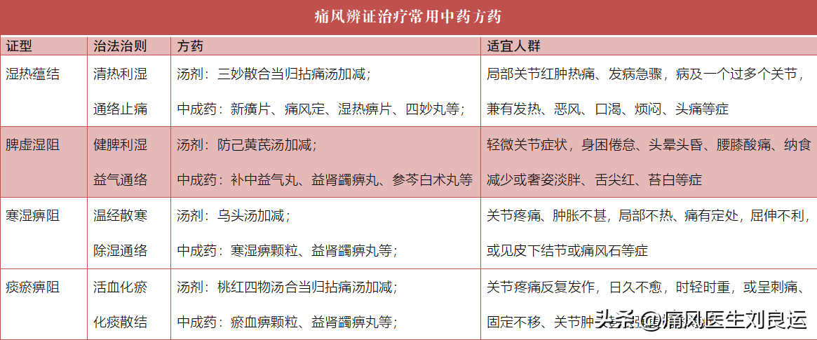 痛风于中医而言,急性发作期分为湿热痹阻证、寒湿痹阻证、热毒夹湿证;间歇期分为痰瘀痹阻证、脾虚湿阻证等;慢性期分为肝肾亏虚证、气血两虚证、脾肾阳虚证等;肾病期分为湿浊内蕴证、膀胱湿热证、气阴两虚证等。