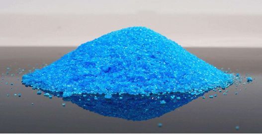 胆矾,别名:石胆、蓝矾。本品为硫酸盐类矿物胆矾的晶体,或为人工制成的含水硫酸铜。三斜晶系。晶体作板状或短柱状,通常为致密块状、钟乳状、被膜状、肾状、有时具纤维状。颜色为天蓝、蓝色,有时微带浅绿。条痕无色或带浅蓝。光泽玻璃状。半透明至透明。断口贝壳状。硬度2.5。比重2.1~2.3。性极脆。无臭,味涩,能令人作呕。