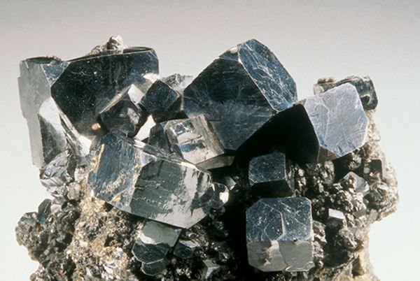 分子式PbS,组成中常含有Ag、As、Cu、Zn、Se等元素。晶体外形常呈立方体,有时为立方体和/面体的聚形,晶体形态具有标型意义一般高温热液阶段发育立方体或立方体和八面体的聚形,低温热液阶段则以八面体为主。集合体常呈粒状和致密块状。常见硫化物。方铅矿颜色呈铅灰色,条痕呈灰黑色,金属光泽。摩氏硬度2-3, 比重7.4-7.6,发育三组相互垂直的完全解理,故它很容易裂成立方体小块。