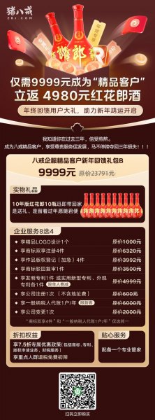 年底既是企业业务冲刺的关键时期,也是企业维护客户、团队建设的重要节点。为此,猪八戒网还特意为八戒企服精品客户甄选定制了红花郎酱香白酒。即日起,凡是加入八戒企服精品客户的企业,均可获得10年版红花郎酱香白酒新年回馈礼包。