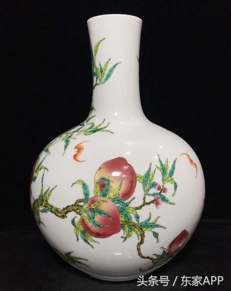 清乾隆九桃五福天球瓶,以蝠寓意福、桃寓意寿,组成福寿双全的寓意