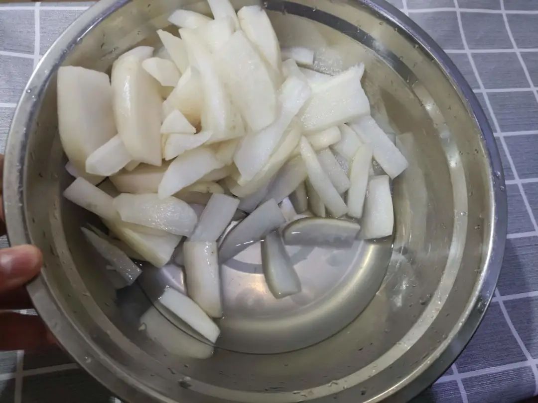 1.白萝卜洗净后放入案板,将其切成长条状,切好的萝卜条加入一勺食盐,筷子搅拌均匀,放着腌制半小时;食盐腌制白萝卜时为了去除萝卜中的苦涩味。白萝卜杀水后,再用凉白开水洗净,捞出沥干水分。