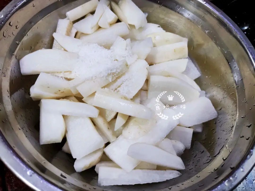 2.切好的白萝卜放入盆中,加入1勺食盐,用筷子将它们搅拌均匀。