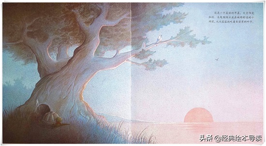 这颗大树腰身很粗壮,枝叶也很繁茂,棱角也很分明,显示出深耕大地傲视苍穹的力度。是否反衬出外表柔弱行动迟缓的小乌龟的内心坚韧呢!半个红日升出海面,映红了天空,映红了大地,天地相连同辉,开阔而一望无际,朦胧的树冠与动感飞翔的雄鸽形成一幅意境悠远的风景图,而主人公随着一彤红日的升起,犟龟的一天开始了。