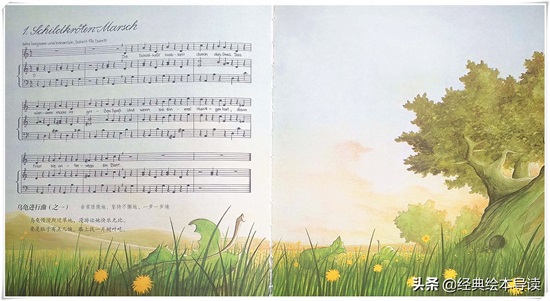 一般的图画书,只有图画与文字两种元素,这本书还有个很大的亮点,除图画和文字外,就是威尔弗里德·希勒根据故事的内容和节奏,特意谱写了10支曲子,这10支曲子与图画、文字相互衬托,紧密融合,使乌龟、蜘蛛、蜗牛、壁虎等角色的形象更加鲜活,使故事更具趣味性。孩子们边听故事边听配乐,在背景音乐的陪伴下认识陶陶,融入情景中。