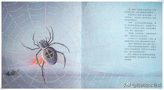 巨大的蜘蛛网的特写占据了整个跨页,但让我感兴趣的是蜘蛛背部的图案,我发现蜘蛛背上的图纹是典型的曼陀罗图形,茶色曼陀罗代表着理性,印证了蜘蛛的思维模式,圆象征人的心灵追求圆满的需要,追求一个自由永恒的境界。