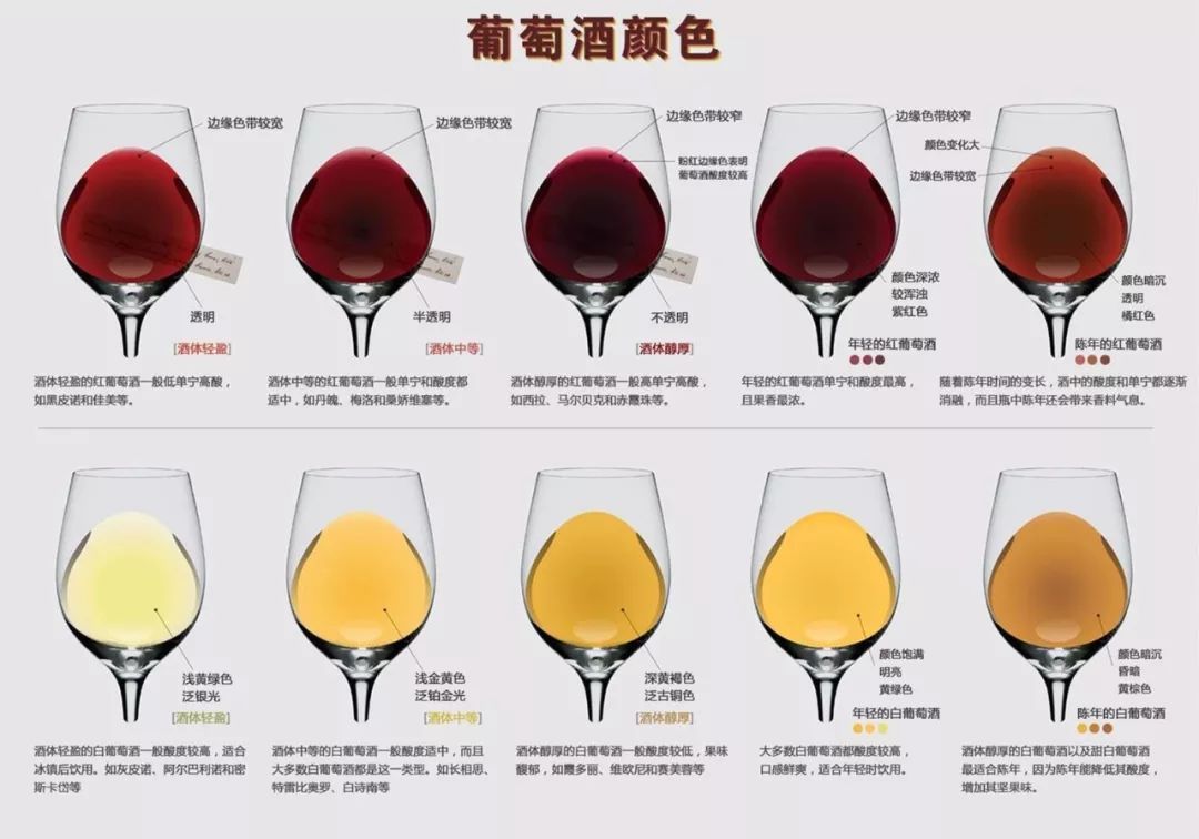 首先第一点就是颜色的变化。红葡萄酒陈年时间越长颜色会变得越浅,而白葡萄酒陈年时间越长会变得越来越深。颜色的变化如图所示: