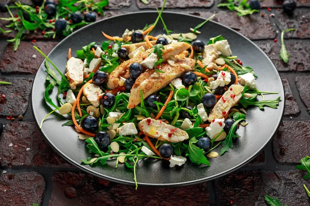 材料:葡萄、蓝莓、沙拉菜、鸡胸肉、胡萝卜丝、沙拉酱适量。