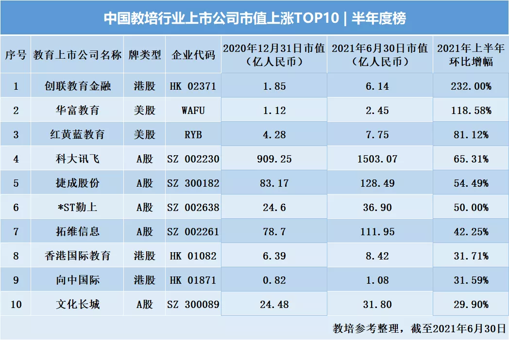1)创联教育金融(HK02371)+232.00%;2)华富教育(WAFU)+118.58%;3)红黄蓝教育(RYB)+81.12%;4)科大讯飞(SZ002230)+65.31%;5)捷成股份(SZ300182)+54.49%;6)*ST勤上(SZ002638)+50.00%;7)拓维信息(SZ002261)+42.25%;8)香港国际教育(HK01082)+31.71%;9)向中国际(HK01871)+31.59%;10)文化长城(SZ300089)+29.90%。