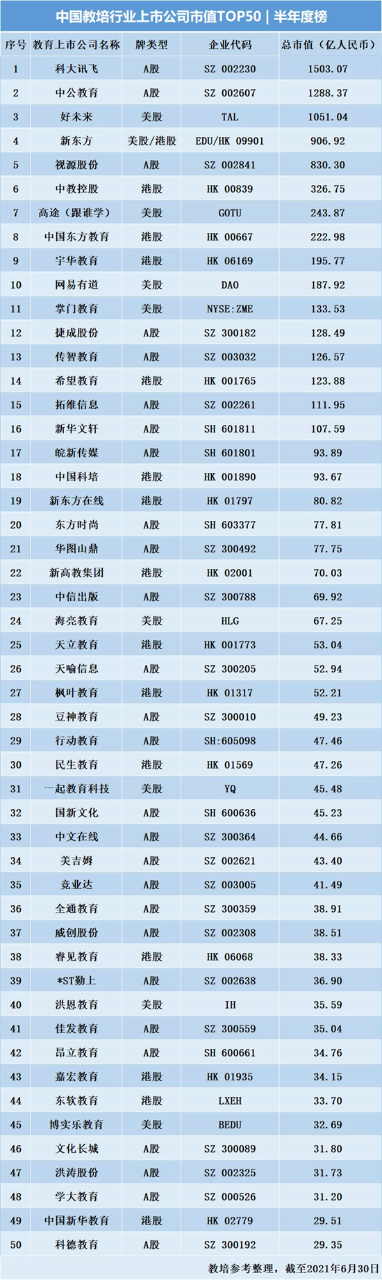 截至2021年6月30日,《中国教培行业上市公司市值TOP50》中,美股上榜的教育企业共9家(其中新东方归入美股统计),港股上榜的教育企业共14家,A股上榜的教育企业共27家。
