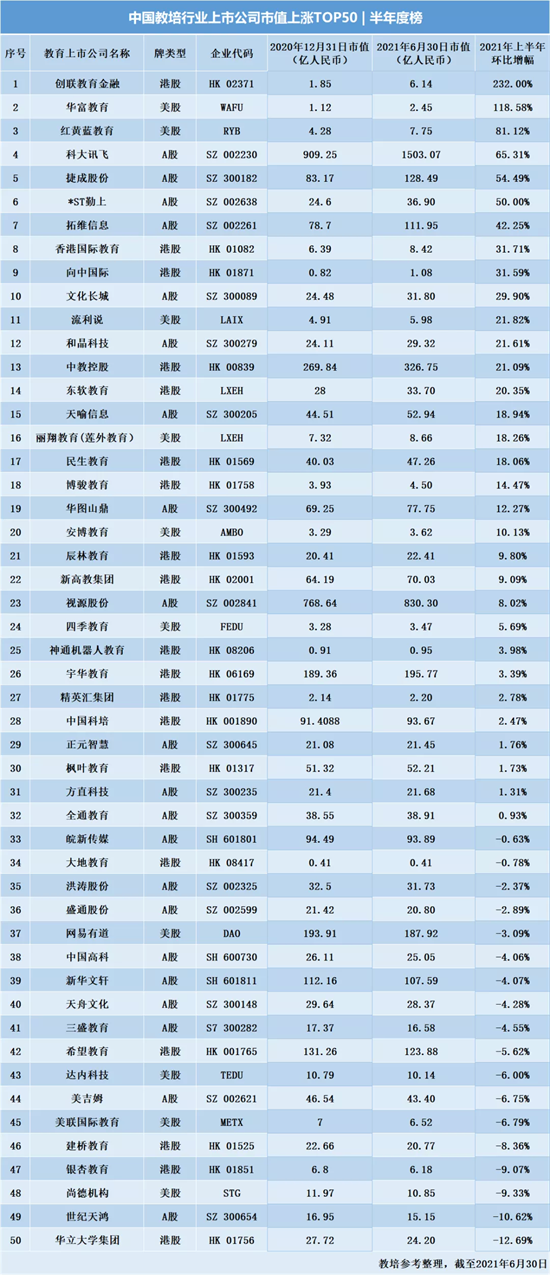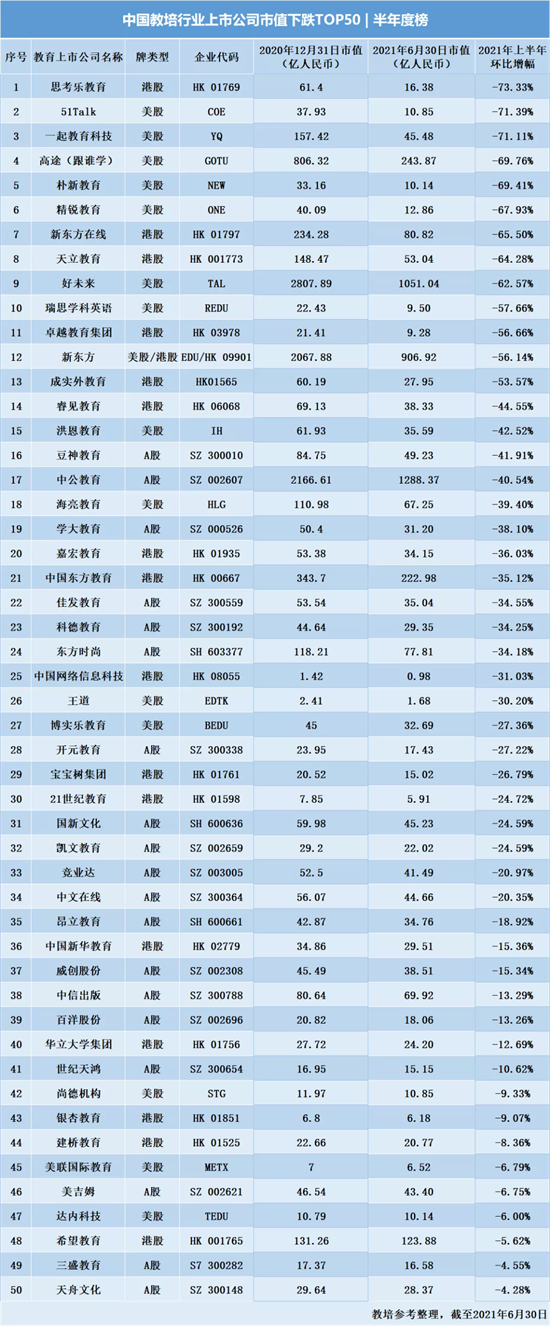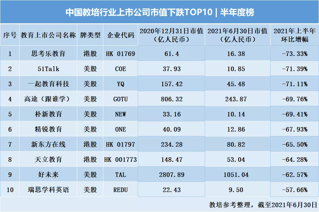 自2020年12月31日至2021年6月30日,思考乐教育(HK01769)市值下跌73.33%,51Talk(COE)市值下跌71.39%,一起教育科技(YQ)市值下跌71.11%,高途/跟谁学(GOTU)市值下跌69.76%,朴新教育(NEW)市值下跌69.41%,新东方在线(HK 01797)市值下跌65.5%,好未来(TAL)市值下跌62.57%……