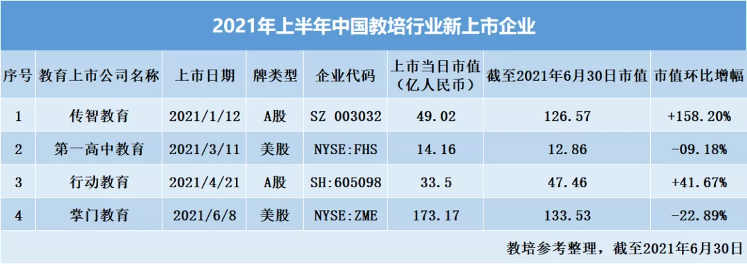 2021年上半年,新增教育上市企业4家,分别为传智教育(SZ003032)、第一高中教育(NYSE:FHS)、行动教育(SH:605098)、掌门教育(NYSE:ZME),截至6月30日,它们的市值分别为126.57亿元、12.86亿元、346.97亿元、47.46亿元、133.53亿元。