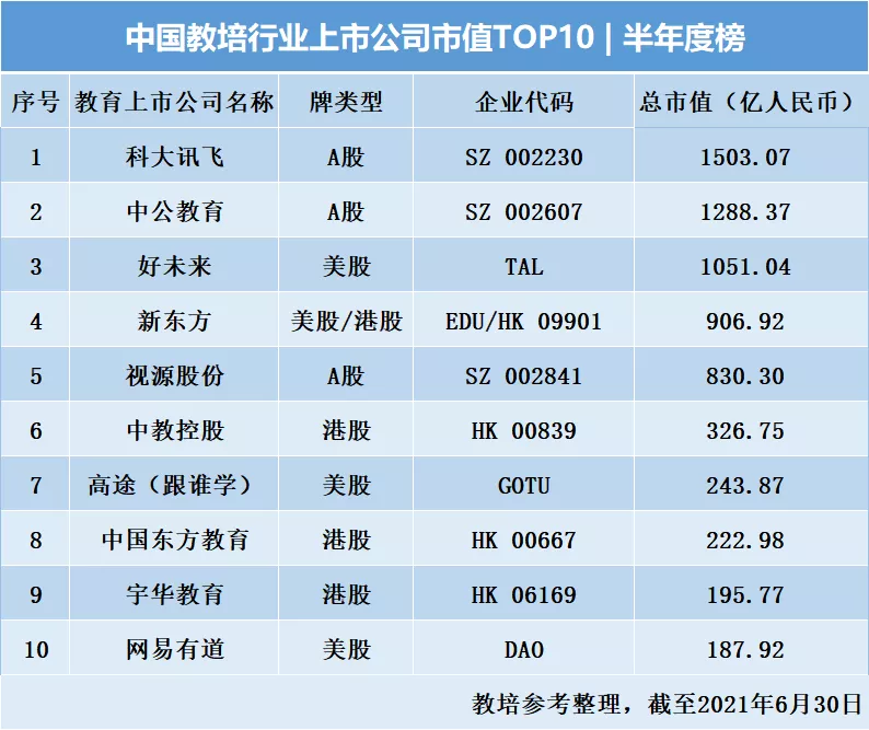 1)科大讯飞(SZ002230)1503.07亿元;2)中公教育(SZ002607)1288.37亿元;3)好未来(TAL)1051.04亿元;4)新东方(EDU)906.92亿元;5)视源股份(SZ002841)830.3亿元;6)中教控股(HK00839)326.75亿元;7)高途/跟谁学(GOTU) 243.87亿元;8)中国东方教育(HK00667)222.98亿元;9)宇华教育(HK06169)195.77亿元;10)网易有道(DAO)187.92亿元。