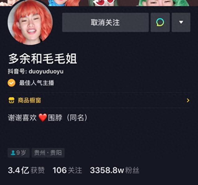 多余和毛毛姐,抖音号:duoyuduoyu,目前抖音粉丝量为:3358.8W,获赞量为:3.4亿,目前红人榜排名为NO.2。
