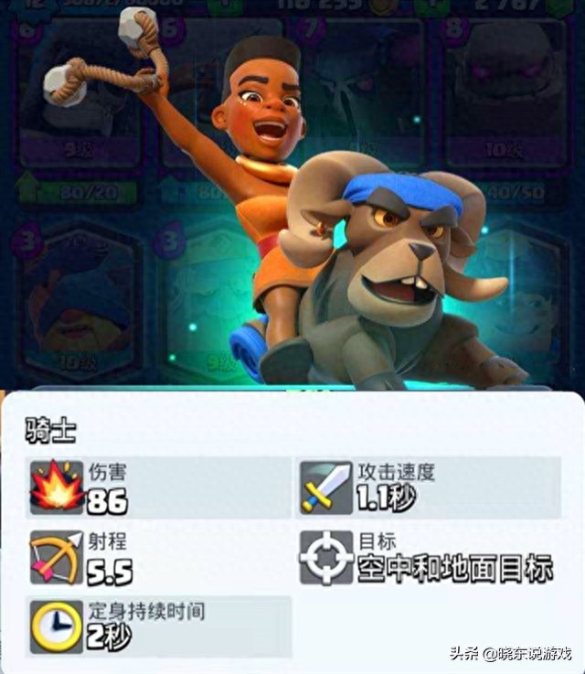 而骑士的攻击目标为空中和地面单位,伤害86点,射程5.5格,并且还有接近于定身的减速效果,可持续2秒。在实战中,蛮羊骑士可以利用她的减速效果克制野猪骑士、气球兵等等单体卡牌。不过她的血量是和蛮羊共享的,一旦蛮羊挂掉,她也就随之而去了。