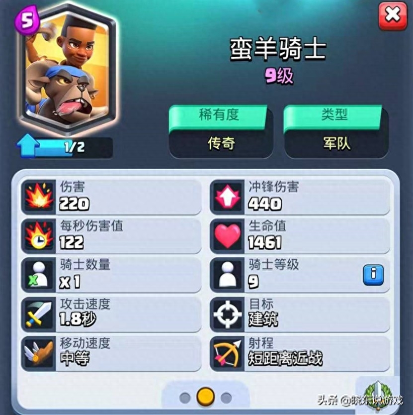 先来看下蛮羊骑士的属性,这张卡牌费用5点,稀有度是传奇品质,因此她的面板属性也是相当的多。咱们可以把蛮羊骑士看作是两张卡牌,首先是蛮羊,它的攻击目标为建筑,伤害为220点,不过一旦发起冲锋,这个伤害值就会加倍。生命值1461点,在5费卡牌里只能算是凑合。