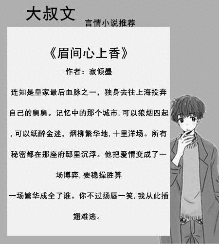 重点:民国文。男主是民国时期伤害的大财阀,腹黑阴冷很可怕的一位大叔,男主三十八岁,男女主是相差二十岁左右,女主属于皇室血脉,家道中落,母亲失踪,于是从北平到上海来投奔舅舅(即男主)PS:算是伪舅甥文。因为在那个封建时期,所以男主已经有妻子了,而且还有一儿一女,不过男主并没有喜欢过别人,也没有谈过恋爱,喜欢上女主后就再也没有碰过别的女人,女主是超级好看,属于那种清水芙蓉的美女。