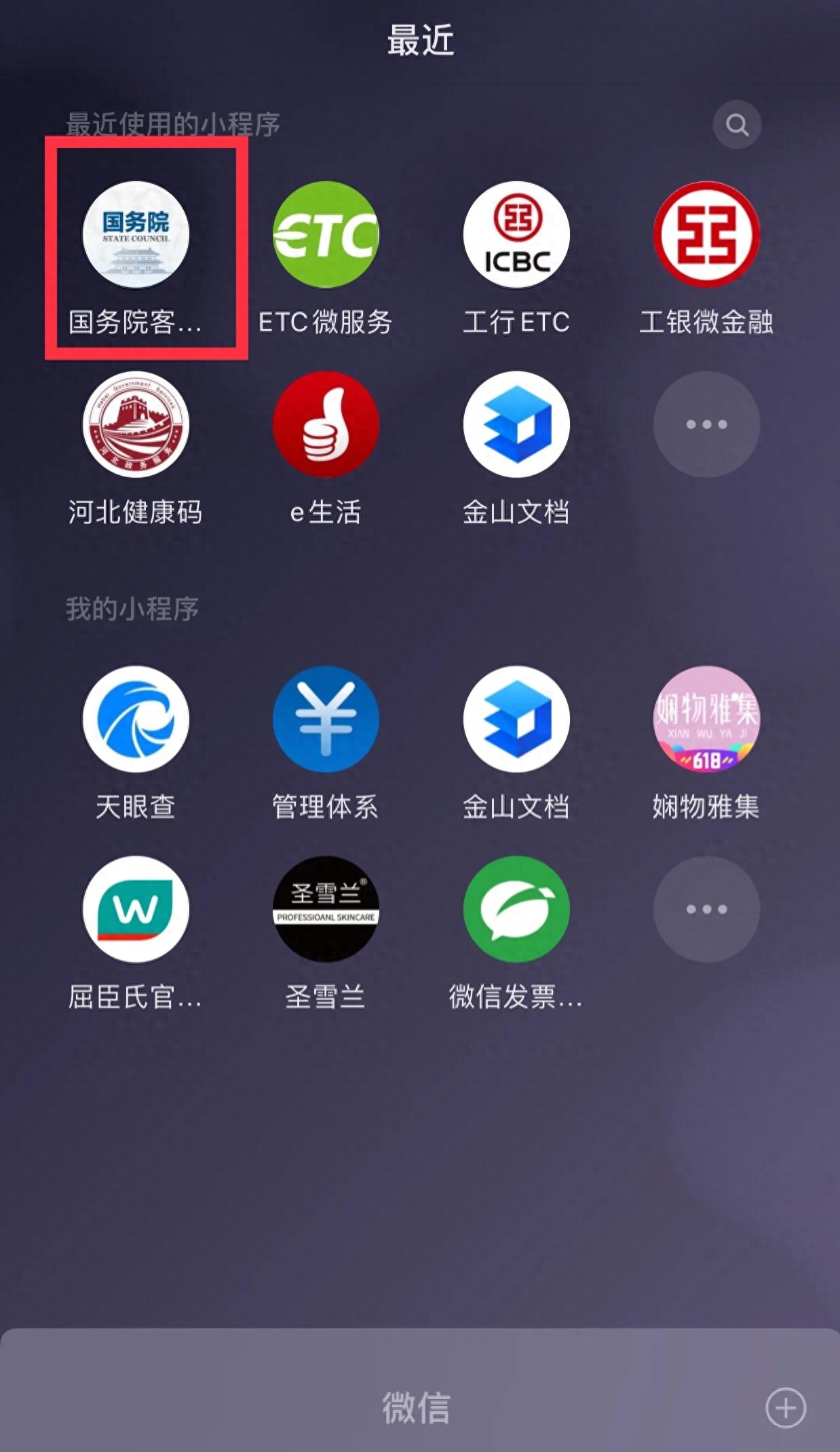 首先,在微信页面找到“国务院客户端”,因为我前一段时间使用过,所以直接下滑就找到了,