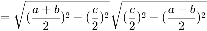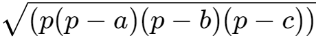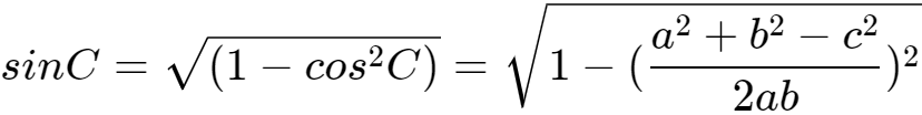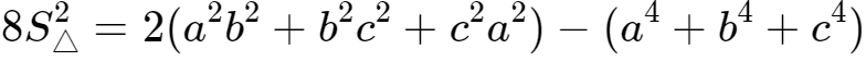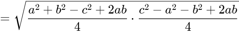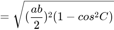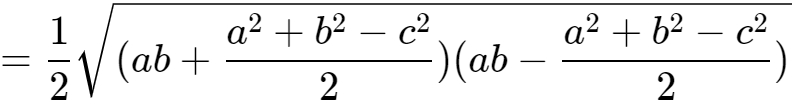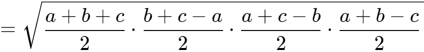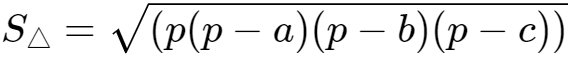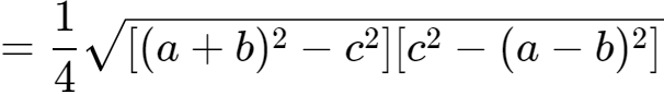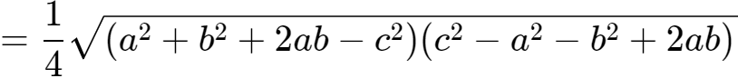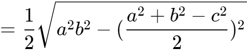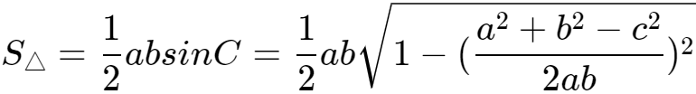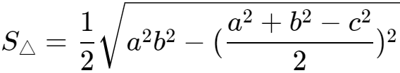 2、已知三角形三边a、b、c,则s=1/4*√[2(a^2b^2+ a)(p – b)(p – c)] (海伦公式)(p=(a+b+c)/2)。
