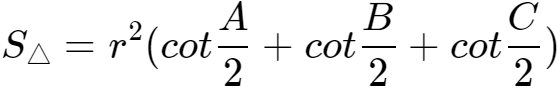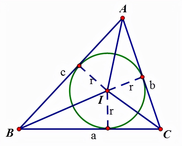 4、设三角形三边分别为a、b、c,内切圆半径为r,则三角形面积=(a+b+c)r/2。