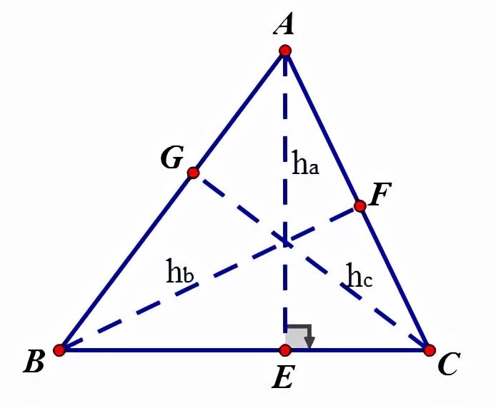 如上面的三角形高线图所示,首先,我们能够想到的三角形面积公式是底乘高的一半,即