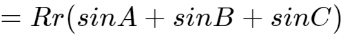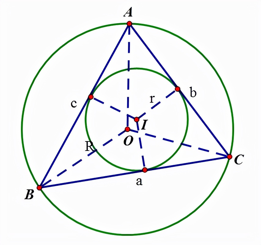 如上图所示,三角形ABC,记a,b,c为三边的长,A,B,C为三个对应的三个内角的大小,R表示外接圆半径,r表示内切圆半径,p表示周长的一半,即