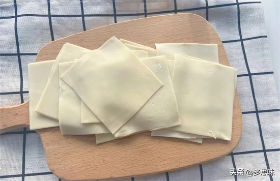 4、两片重叠擀成可以透出手指的薄度切成想要的大小即可,这样做出来的混沌皮又薄又软,煮好后爽滑可口,自己做的宝宝吃起来更放心!