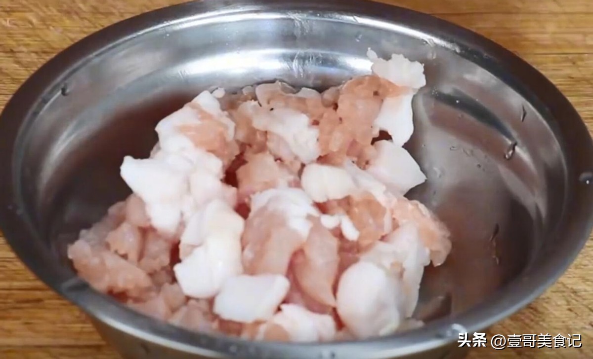 5.准备一小块猪肉,先用清水将猪肉表面清洗一遍,然后用厨房纸巾将猪肉表面擦干。接着,把猪肉放在案板上,先用菜刀将它切成厚片,再把厚片切成小丁。最后,把猪肉丁反复的剁,直到将它们切成肉沫。将切好的肉沫放进碗里,备用。