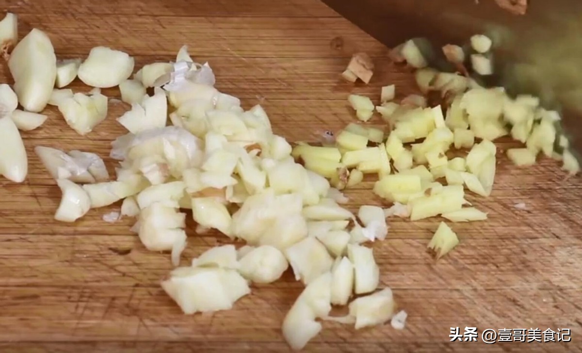 3.取出一小块生姜,先把它放在清水里,用小刷子将生姜表面清洗干净,然后取出来控干水。接着,把生姜放在案板上,先用菜刀将它切成生姜片,再把生姜片放成一排,切成细丝,最后将生姜丝切成生姜沫。把切好的蒜沫和姜沫放在盘子里待用。
