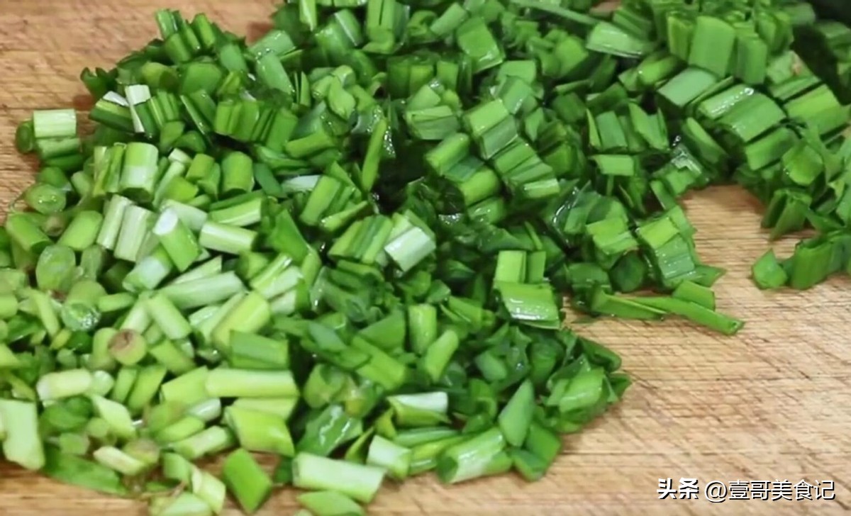 4.准备一把新鲜的韭菜,先放进清水中,再加入一点食盐,用食盐水将韭菜搓洗一遍,尤其是根部要清洗干净。洗净之后将韭菜取出来控干水,然后放在案板上。取出菜刀,先把韭菜根部1厘米左右的部分切掉不要,再把剩下的部分切成碎丁。切好后,将韭菜丁放进碗里待用。